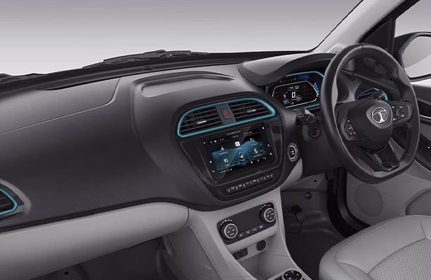 The Tata Tigor EV delivers an impressive 315 km range on a single charge, eliminating range anxiety for city commutes and weekend getaways. Its 26 kWh battery capacity ensures long-distance travel without frequent stops. With DC fast charging (10-80% in 59 min), you can quickly power up during breaks. The AC charging (0-100% in 9H 24min) is perfect for overnight charging. Whether for daily drives or spontaneous trips, this EV keeps you moving confidently. The 4-star Global NCAP safety rating ensures peace of mind. Add cruise control for relaxed highway cruising, and the digital instrument cluster keeps you informed. The signature aqua-colour accents make it stand out, while the Z Connect app lets you monitor charging remotely.
